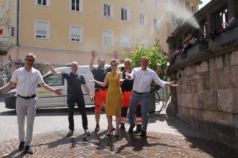 Sommerfrische Station in unserer Innenstadt: Team des Villacher Wasserwerkes und der Feuerwehr haben kühlenden Sprühnebel am Hauptplatz und am Hans-Gasser-Platz installiert.